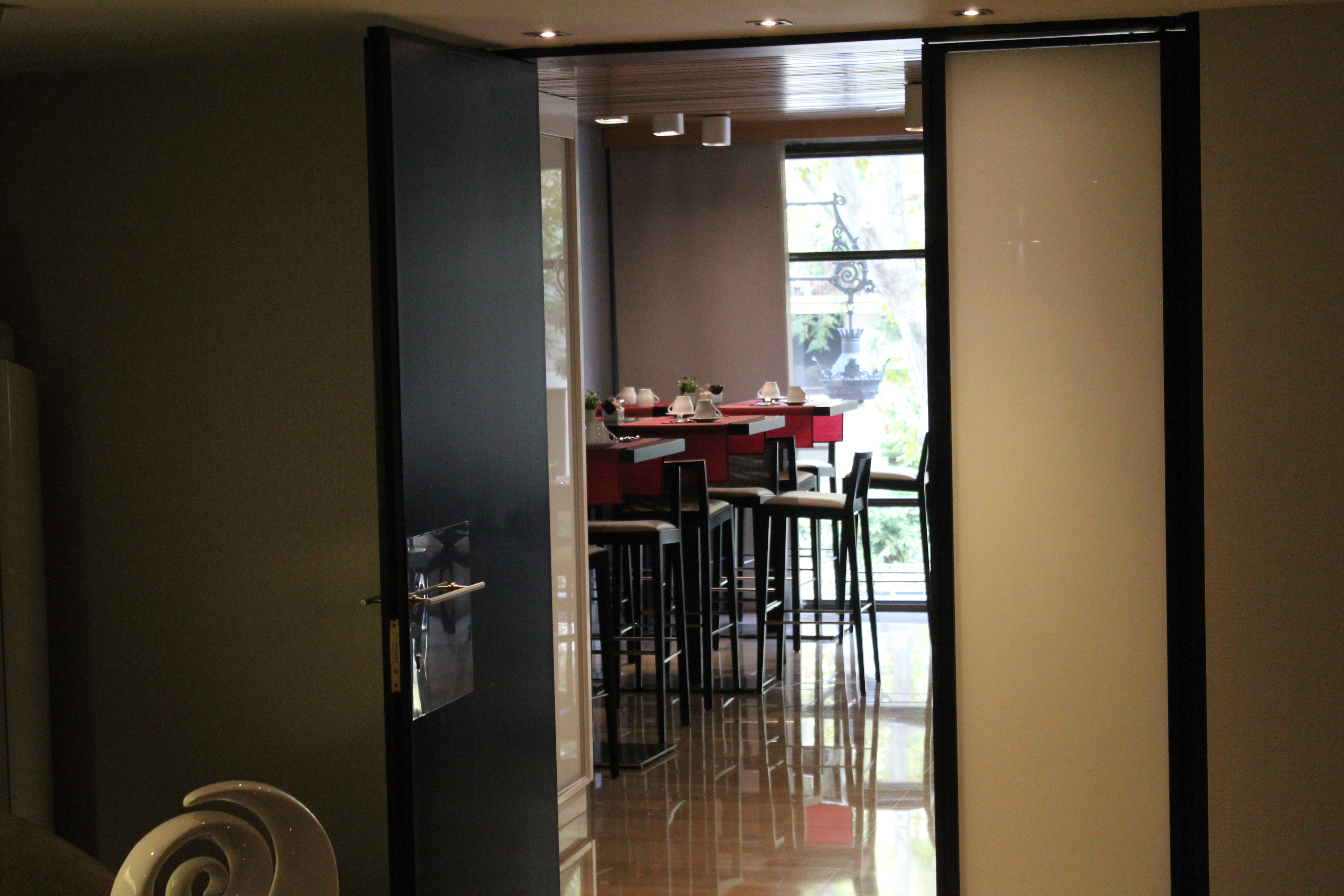 La sala da pranzo con tavoli e banconi si affaccia sulla strada per apprezzare il panorama. Il buffet propone una colazione internazionale con ampia scelta di brioches, muffin, ciambelle, frutta fresca e frutta secca, yogurt, bacon, verdure, bevande calde e succhi di frutta e tanto altro.