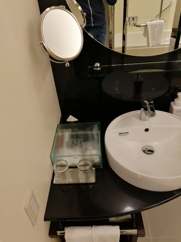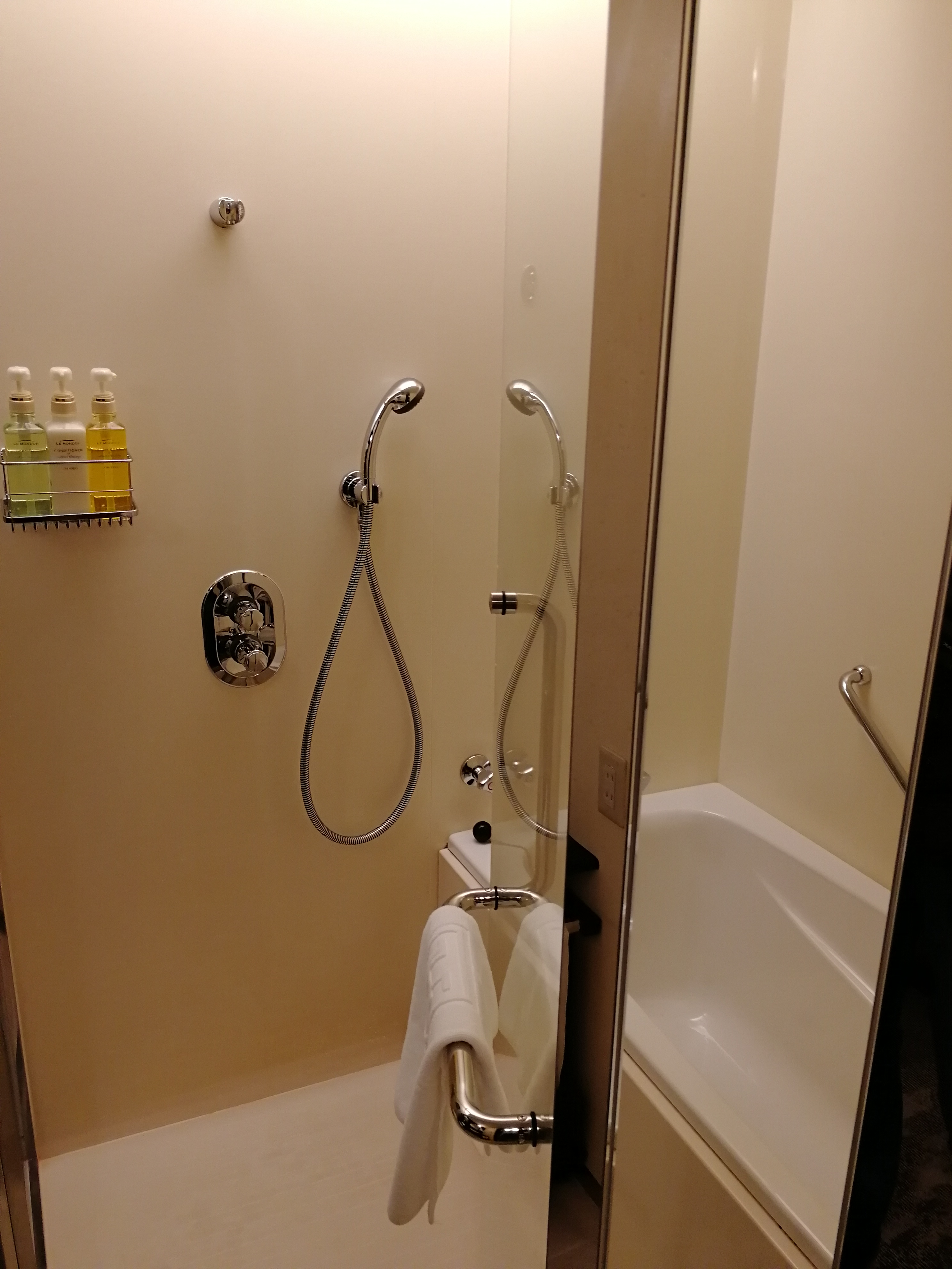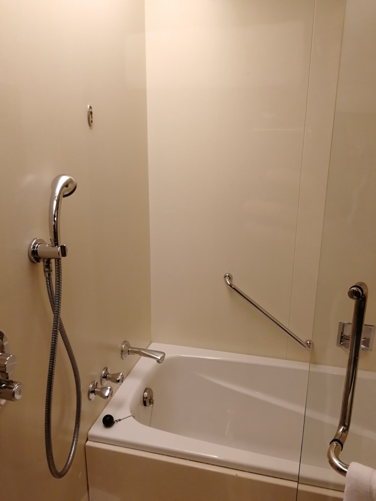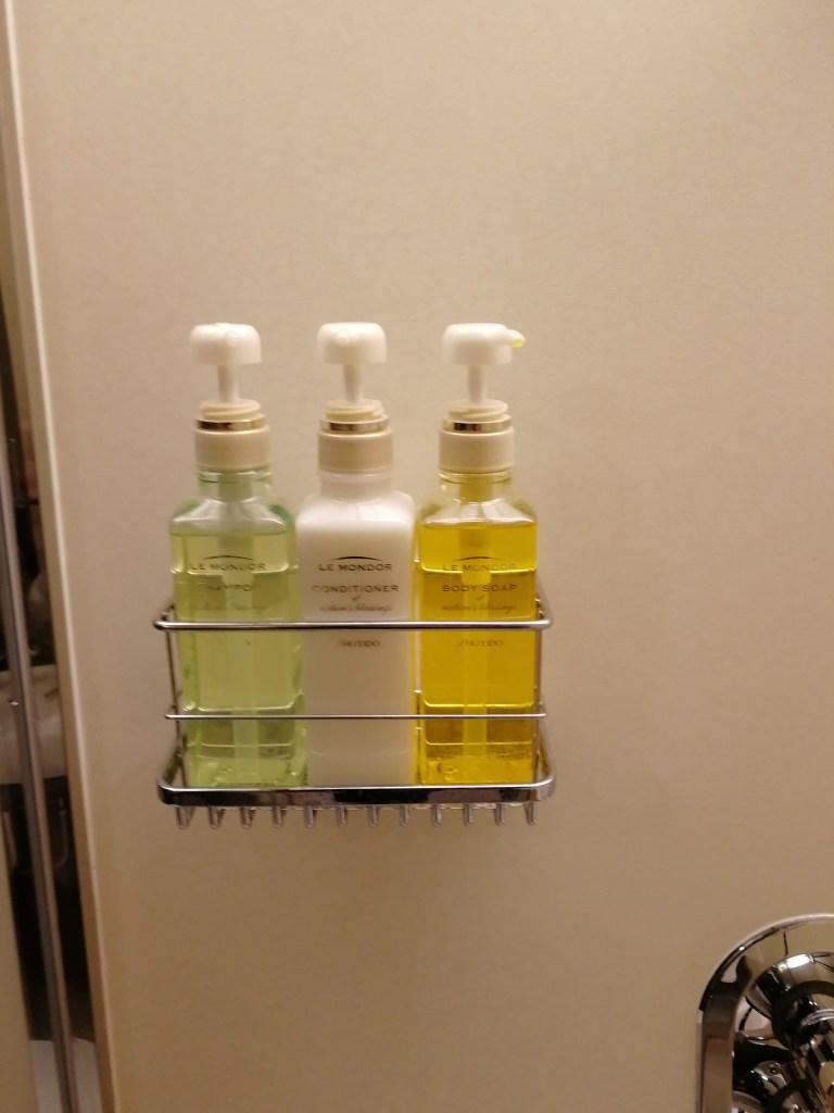 Bagno grande con doccia e vasca, con prodotti di Shiseido. In effetti l’hotel è nello stesso edificio della sede del famoso brand.
