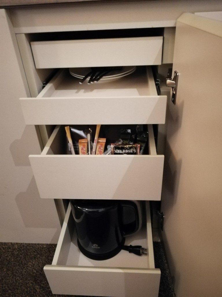 Nella dotazione della camera, oltre alle ciabattine, asse da stiro, immancabile spray igienizzante troverete anche : deumidificatore, bollitore, bustine per farsi tè o caffe dei piattini con posate, delle bottiglie di acqua in omaggio, ma anche dei calici per il vino ed un secchiello per il ghiaccio, mai visto prima.